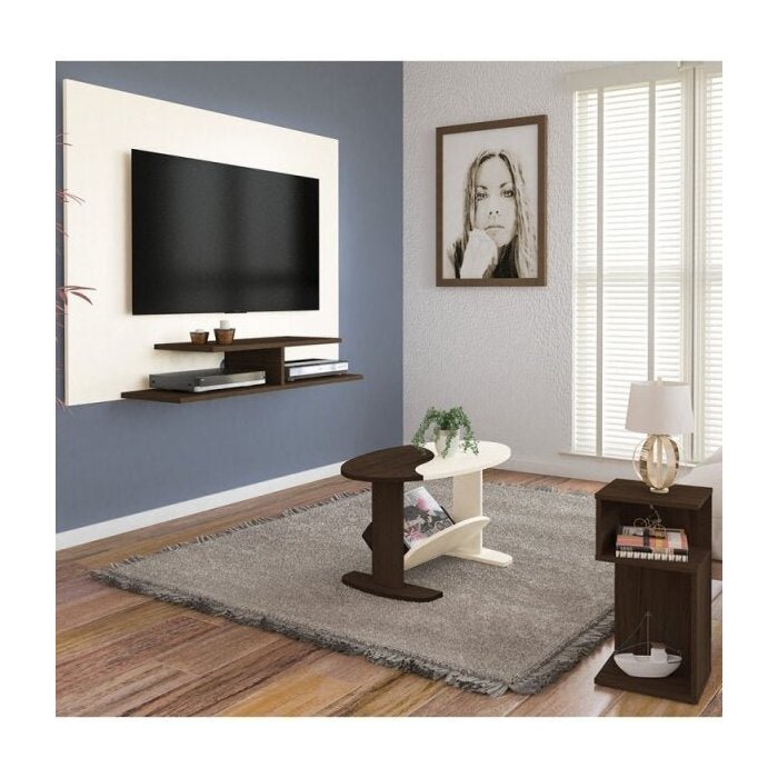 Conjunto para sala de estar Jet Plus, com Painel, Mesa de centro e Mesa de Apoio Artely Amêndoa/Off White