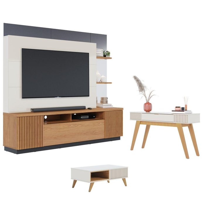 O Home suporta TVs de até 70 polegadas, contém três portas com detalhes ripados, três nichos, uma parede em espelho, dando charme e sofisticação para sua sala. E para completar, ainda conta com duas prateleiras com iluminação LED destacando ainda mais a beleza do produto