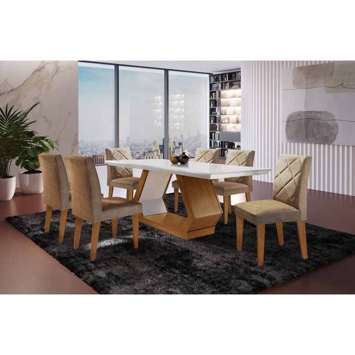 Conjunto para Sala de Jantar Mesa Islândia 180cm Tampo Mdf Canto Reto com 6 Cadeiras Irlanda Rufato