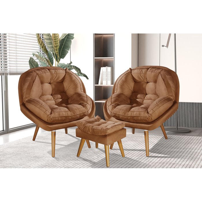 Conjunto Poltronas Sênior em Suede Premium com Puff e Pés de Madeira:terracota