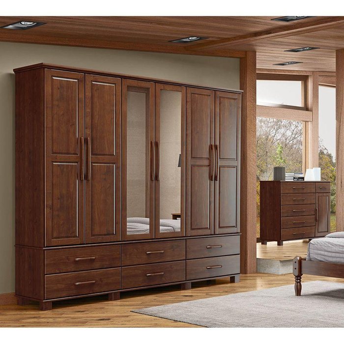 Conjunto Quarto Ouro Café Guarda-Roupa Casal 6 Portas 6 Gavetas, Cômoda Sapateira 4 Gavetas Madeira Pinus - FinestraEspecificações Técnicas Total:Cor: CaféConteúdo das Embalagens: 1 Cômoda Sapateira, 1 Guarda-Roupa, Kit Ferragem, Manual de Montagem.Material Principal: 100% Madeira Maciça de pinus de reflorestamento;Pintura Acetinada Verniz PU e UV;