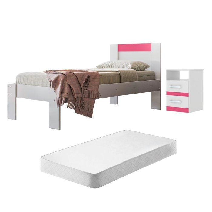 Conjunto Quarto Cama com Mesa Shiva Branco Flex Rosa/Azul com Colchão