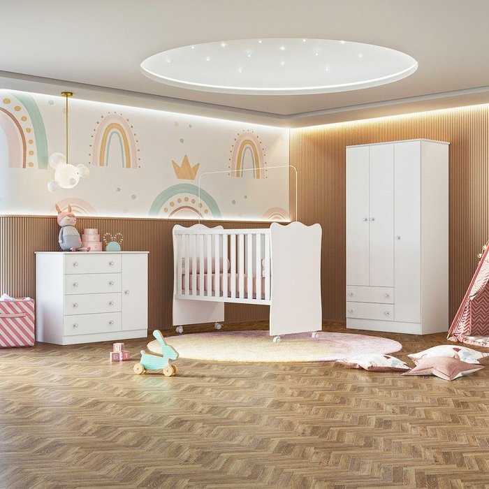 Conjunto Quarto de Bebê Completo Guarda Roupa Cômoda e Berço com Rodízio Doce Sonho Branco