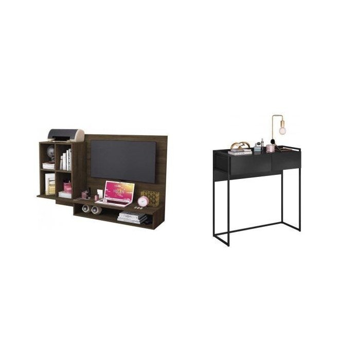 Conjunto Quarto de Solteiro Penteadeira e Escrivaninha com Painel para TV até 37 Polegadas Espresso Cedro/Preto Fosco