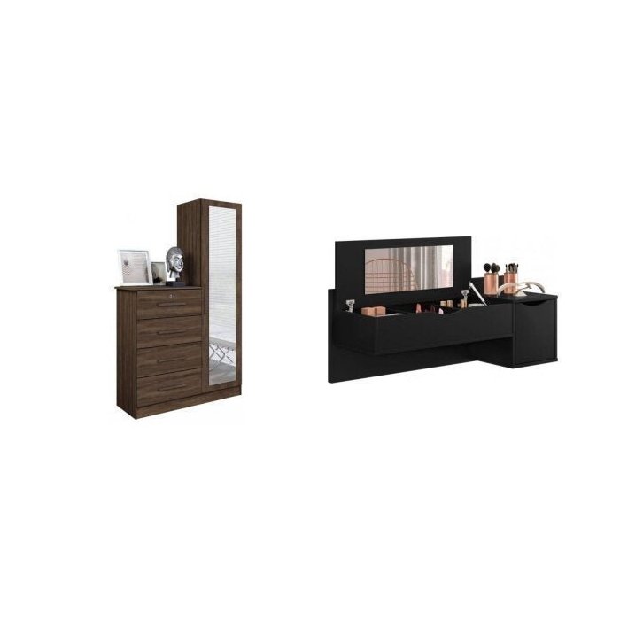 Conjunto Quarto de Solteiro Penteadeira Suspensa com Espelho e Cômoda 4 Gavetas Espresso Móveis Cedro/Preto Fosco