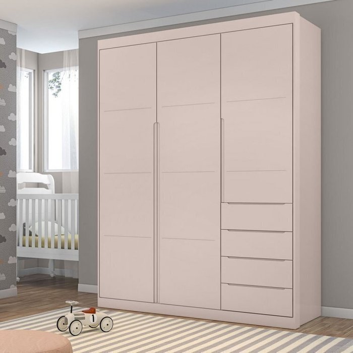 Conjunto Quarto Infantil com Guarda-roupa 3 Portas 4 Gavetas e Cômoda Pérola Rosa