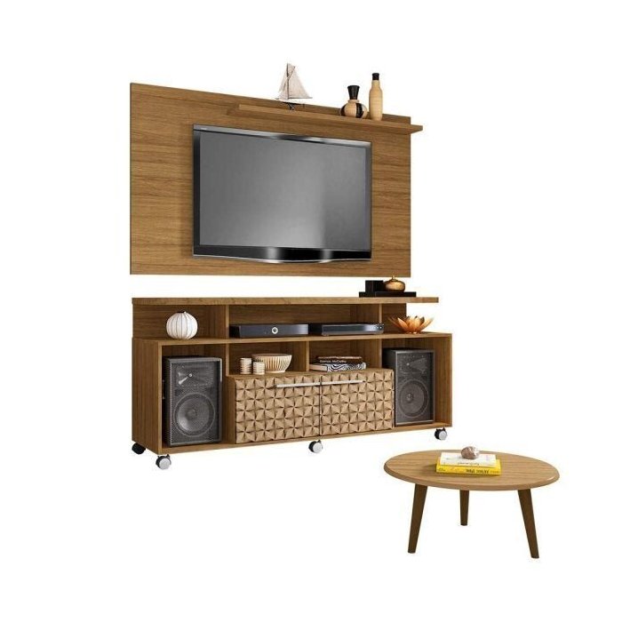 O Conjunto Rack New Centurini com Painel Chanel é ideal para sua sala! Com designer inovador, o rack possui vários nichos ideais para acomodar da melhor maneira possível aparelhos eletrônicos, home theaters, entre inúmeros outros objetos, o que proporciona muito mais charme e requinte ao rack. Ele possui rodízios que facilitam a locomoção quando necessário, sendo que os rodízios frontais possuem acabamento cromado. Tampo com designer de borda curva que agregam ainda mais charme e requinte ao móvel. Porta com luxuosos puxadores de alumínio anodizado e dobradiças metálicas. O Painel moderno possui prateleira superior de MDP de 25mm e comporta TVs de até 50 polegadas. Mesa de Cento estilo retrô com pés de madeira maciça e tampo de MDF.