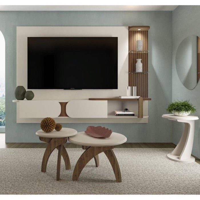 Conjunto Sala de Estar Painel para Tv até 72 Pol com Mesa de Centro e 2 Mesas Laterais Jade/tutti Off White/Pinho