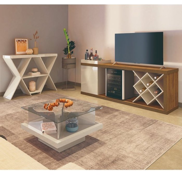Conjunto Sala de Estar Rack Bar Madrid com Mesa de Centro em Vidro Temperado e Aparador com 2 Nichos