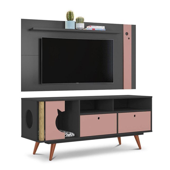 Conjunto Sala De Estar Rack Retro Pet Angora + Painel Home Para Tv 55 Polegadas Eyre-grafito/rose - Cor: Cinza