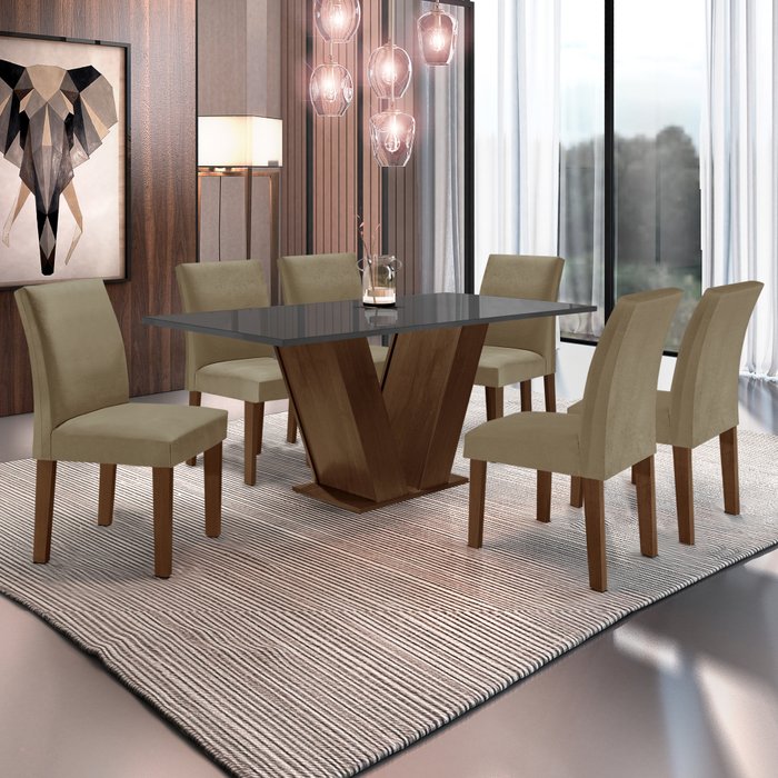 Conjunto Sala de Jantar 1 Mesa 160x80cm Tampo Mdf/vidro 6 Cadeiras Espanha Yescasa Chocolate/Grafite/Suede Marrom Claro