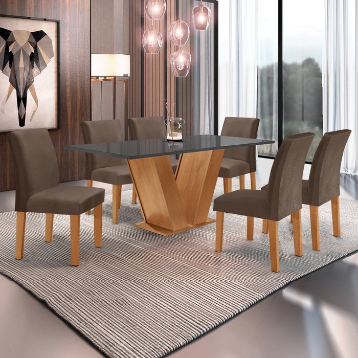 Conjunto Sala de Jantar 1 Mesa 160x80cm Tampo MDF/Vidro 6 Cadeiras Espanha Yescasa Cinamomo/Grafite/Marrom