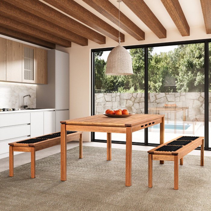 Composto por 1 mesa de 180cm e 2 bancos de 180cmm,o conjunto traço oferece conforto para os seus momentos de lazer, formando o ambiente ideal para desfrutar ocasiões de descontração ou confraternizações com seus amigos e familiares. São resistentes e com um design exclusivo. Produzidos com madeira de eucalipto reflorestado e trançado por artesãos da região de São Bento do Sul, Santa Catarina, com corda trançada chata de 0,22 cm, cor preta de polipropileno. Ideal para varandas, sacadas, espaço gourmet ou churrasqueiras e áreas de lazer cobertas, bem como para compor um ambiente aconchegante na sua sala de jantar.