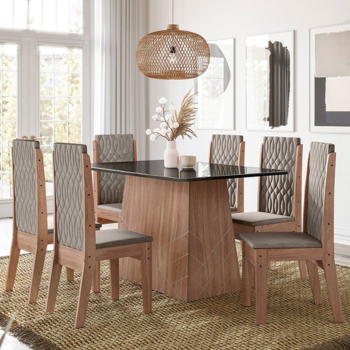 Conjunto Sala de Jantar 135x90cm Tampo Vidro/MDF com 6 Cadeiras Torre Lisboa Amêndoa