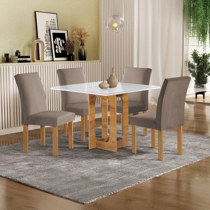 O Conjunto Mesa Carolina 90cm x 90cm com 4 Cadeiras Espanha traz um toque de sofisticação e praticidade para sua sala de jantar. O tampo Dakota Plus com vidro Off White oferece um acabamento elegante, além de ser de fácil manutenção, perfeito para o dia a dia. As Cadeiras Espanha foram projetadas para garantir conforto e estabilidade, proporcionando uma experiência agradável em cada refeição. Compacto e funcional, este conjunto é ideal para espaços menores.