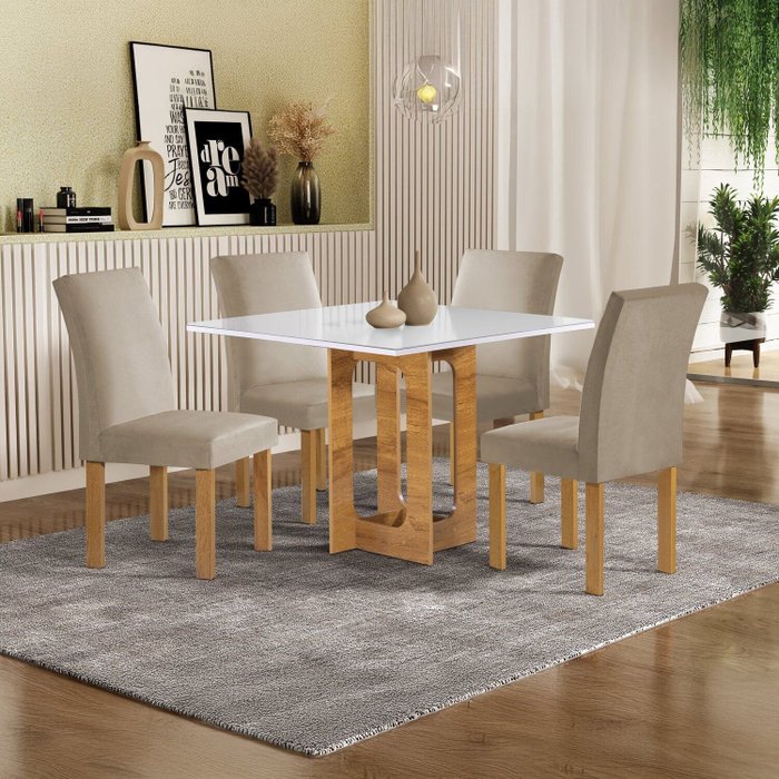 O Conjunto Mesa Carolina 90cm x 90cm com 4 Cadeiras Espanha traz um toque de sofisticação e praticidade para sua sala de jantar. O tampo Dakota Plus com vidro Off White oferece um acabamento elegante, além de ser de fácil manutenção, perfeito para o dia a dia. As Cadeiras Espanha foram projetadas para garantir conforto e estabilidade, proporcionando uma experiência agradável em cada refeição. Compacto e funcional, este conjunto é ideal para espaços menores.