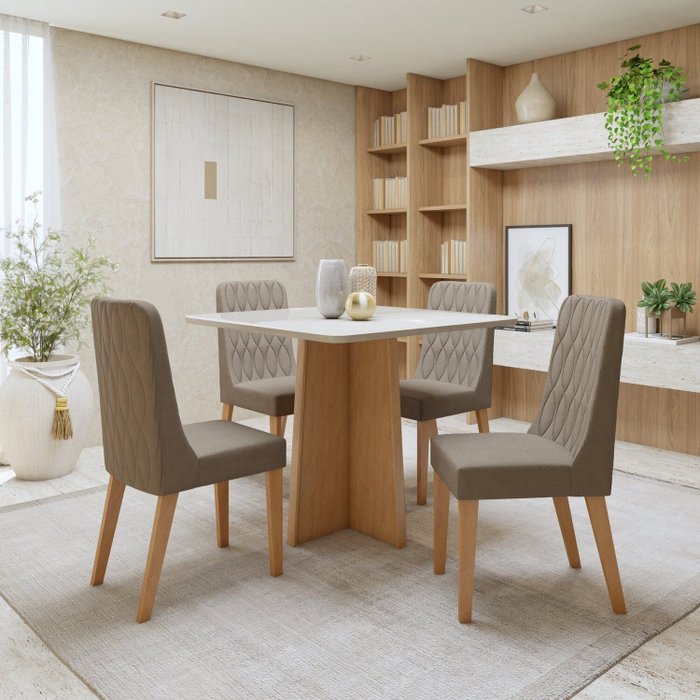 A Mesa Celebrare 90cm com tampo de MDF e vidro, acompanhada pelas 4 Cadeiras Luar , é a escolha perfeita para quem busca praticidade sem abrir mão do estilo. Seu design moderno e compacto se adapta facilmente a espaços menores, oferecendo um toque sofisticado à sua sala de jantar. Ideal para jantares mais íntimos ou como solução funcional para o dia a dia, esse conjunto é conforto, durabilidade e durabilidade, tornando sua casa ainda mais acolhedora.