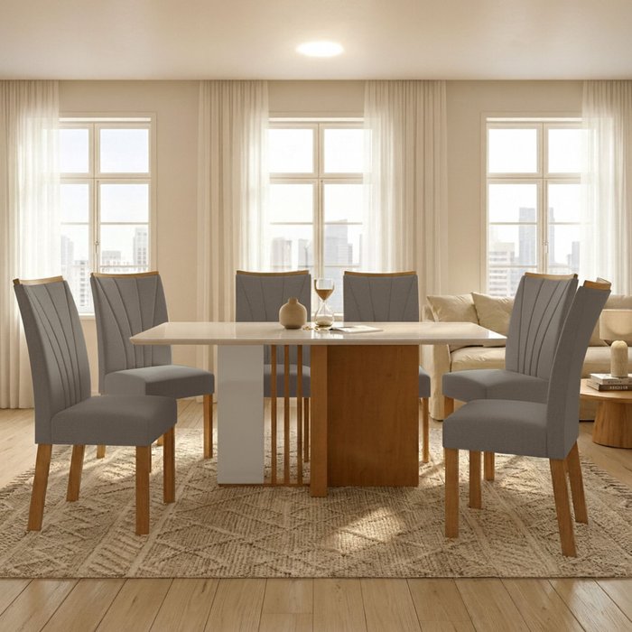 O conjunto de mesa com 6 cadeiras é uma escolha elegante e funcional para sua sala de jantar. A mesa com tampo de vidro apresenta um design moderno e minimalista, adicionando um toque de sofisticação ao ambiente. Sua estrutura robusta garante estabilidade e durabilidade. As seis cadeiras Apogeu complementam perfeitamente a mesa. Com um design contemporâneo e estofamento confortável, oferecem tanto estilo quanto comodidade durante as refeições. Seu acabamento de alta qualidade e detalhes cuidadosamente elaborados conferem uma estética atraente ao conjunto.