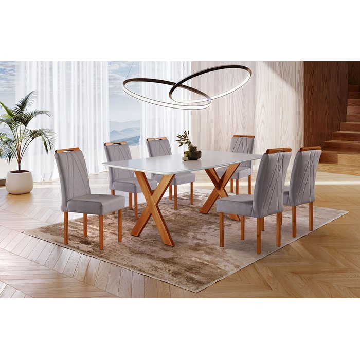 Conjunto Sala de Jantar 6 Lugares Vitória Mesa e Cadeiras Madeira Maciça e Tecido Suede Cinza.