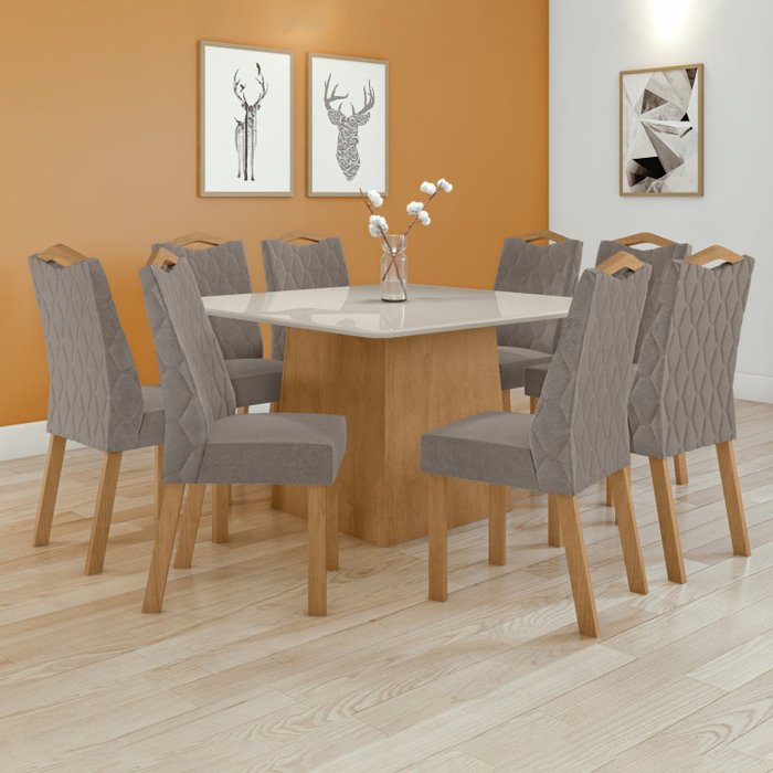 Impressione seus convidados com nosso conjunto de mesa de jantar com 8 cadeiras Vênus. A mesa com tampo de vidro combina design contemporâneo e durabilidade. As cadeiras Vênus, estofadas com materiais de alta qualidade, oferecem conforto e elegância, sendo perfeitas para longos jantares e conversas. Este conjunto é perfeito, proporcionando espaço e charme. É a escolha ideal para quem busca sofisticação e praticidade em um só produto.