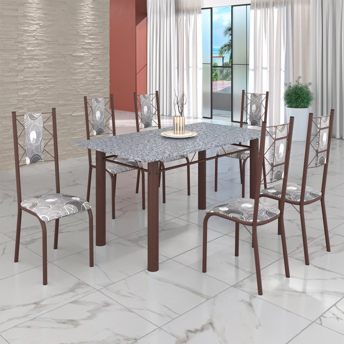 Conjunto Sala de Jantar Bahia Mesa Tubo 140x75cm Tampo Pedra Granito com 6 Cadeiras Paraopeba/Marrom
