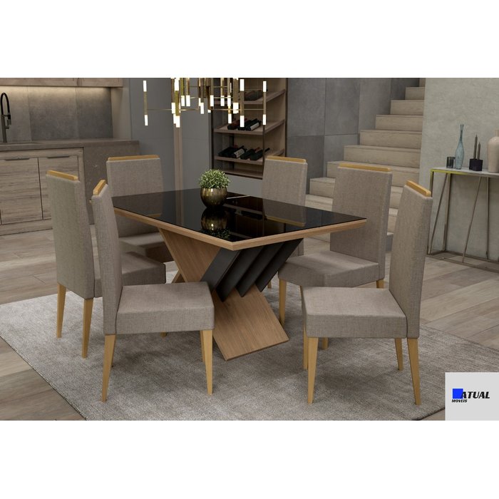 Conjunto Sala de Jantar Base Madri + Tampo Louro c/Preto 1,53 X 0,90 + 6 Cadeiras Vitoria Mel TEC001 (Tampo de Vidro Preto) Madetal