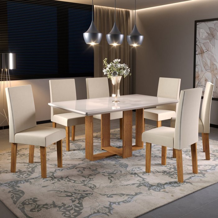 Mesas são indispensáveis para o funcionamento da casa e é no cômodo de confraternização que elas ganham protagonismo. Composto por peças de muito charme, o Conjunto Bilion e Venus torna o uso desse móvel importante com 6 cadeiras para garantir uma usabilidade plena para o seu dia a dia