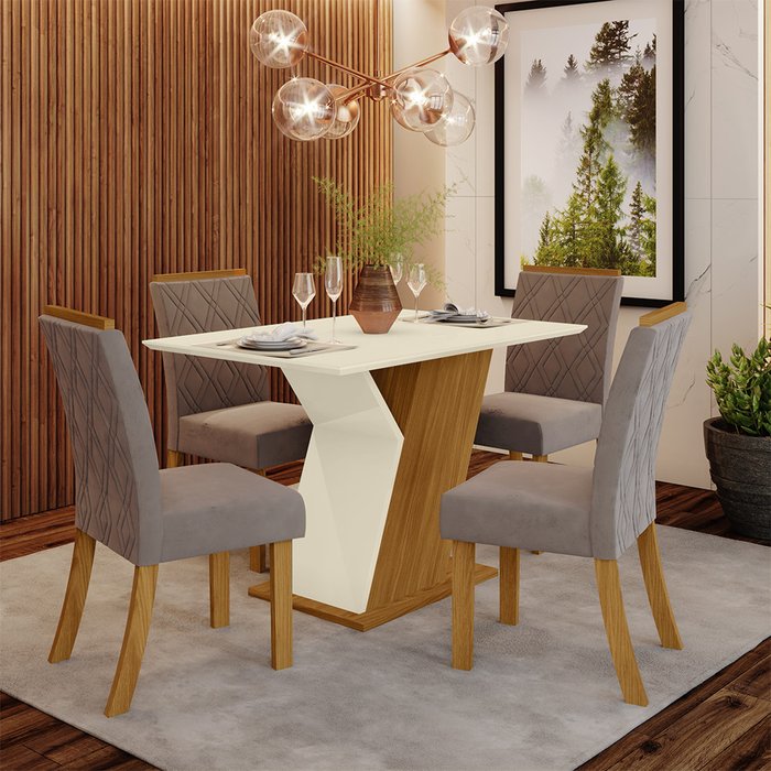Conjunto Sala de Jantar Mesa 120cm Tampo MDF 4 Cadeiras Lupita Casa 812 Nature com Off White e Marrom Amêndoa