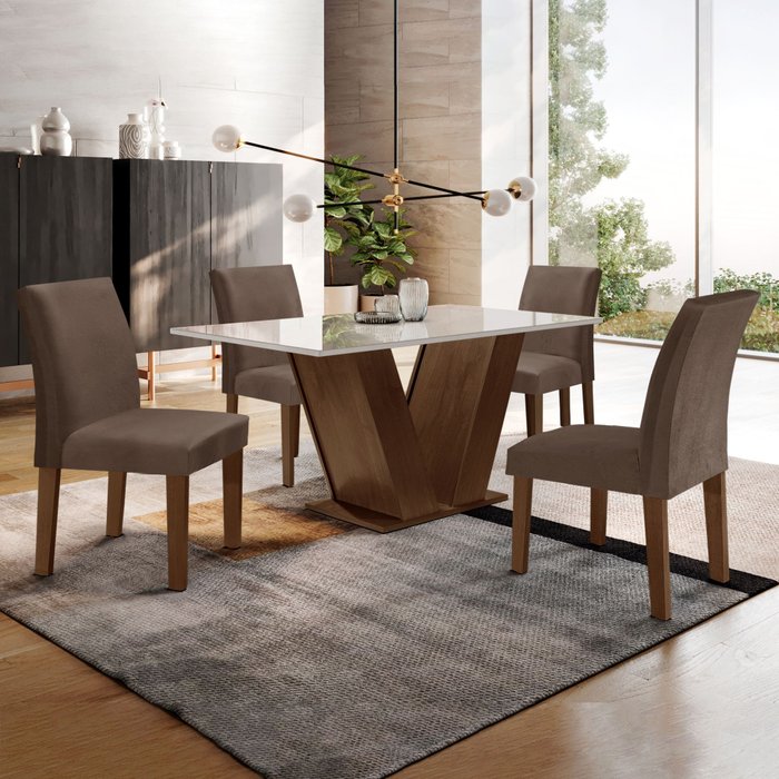 Se você planeja completar a sua casa com bom gosto e charme, então, nosso conjunto de mesa de jantar com 4 cadeiras é o ideal. A mesa com tampo de vidro dá um toque sofisticado e facilita na limpeza, enquanto as cadeiras garantem o conforto para longos momentos especiais. O conjunto de mesa com base em V é uma excelente forma de começar a decoração, não é mesmo?