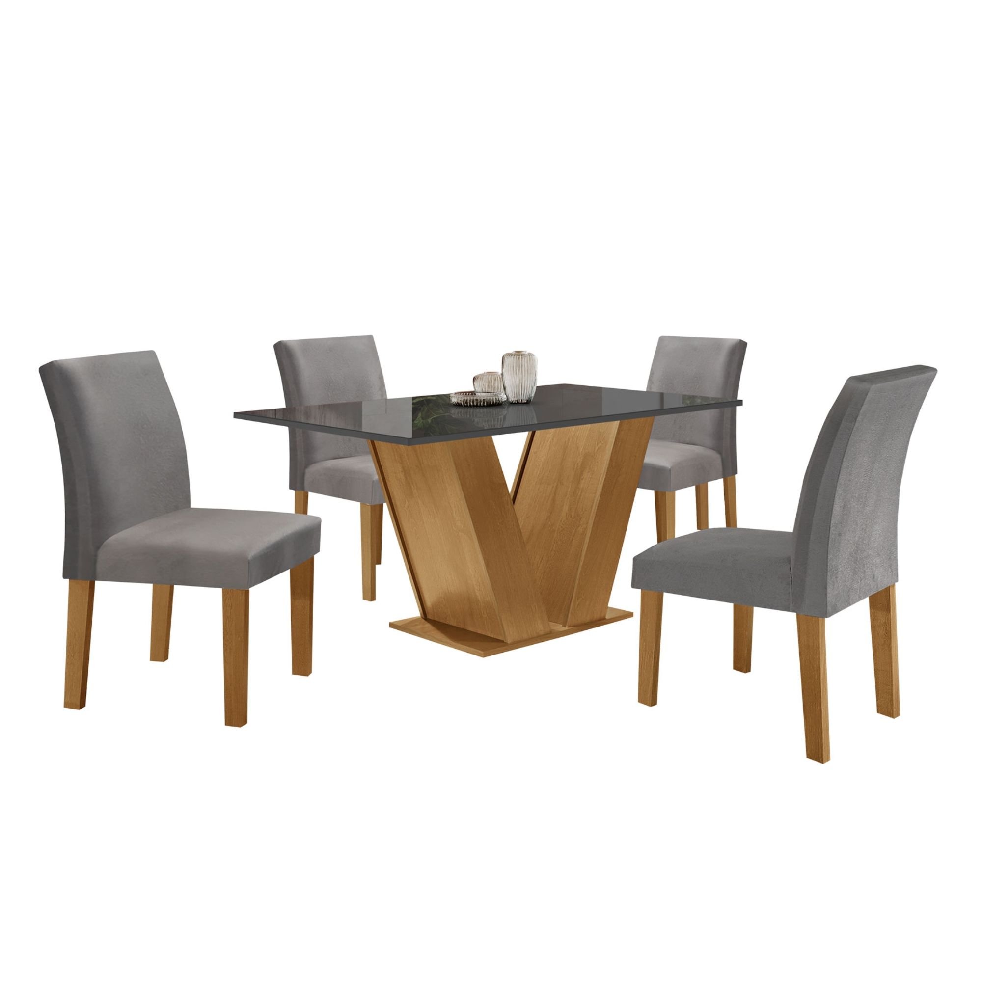 Conjunto Sala de Jantar Mesa 120x80cm Tampo Mdf/vidro com 4 Cadeiras Espanha Yescasa Ypê/Grafite/Suede Cinza