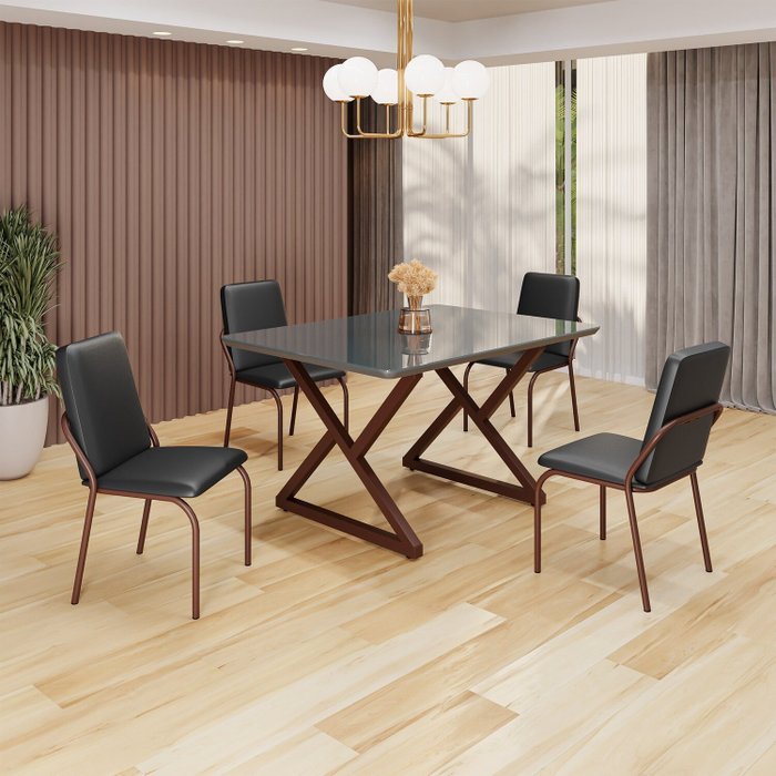Conjunto Sala de Jantar Mesa 120x90cm Base Império Tampo Mdf Laca com Vidro Malibu Preto/Marrom
