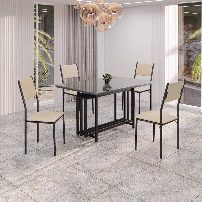Conjunto Sala de Jantar Mesa 120x90cm Base Pérola Tampo Mdf Laca com Vidro Florença Creme/Preto