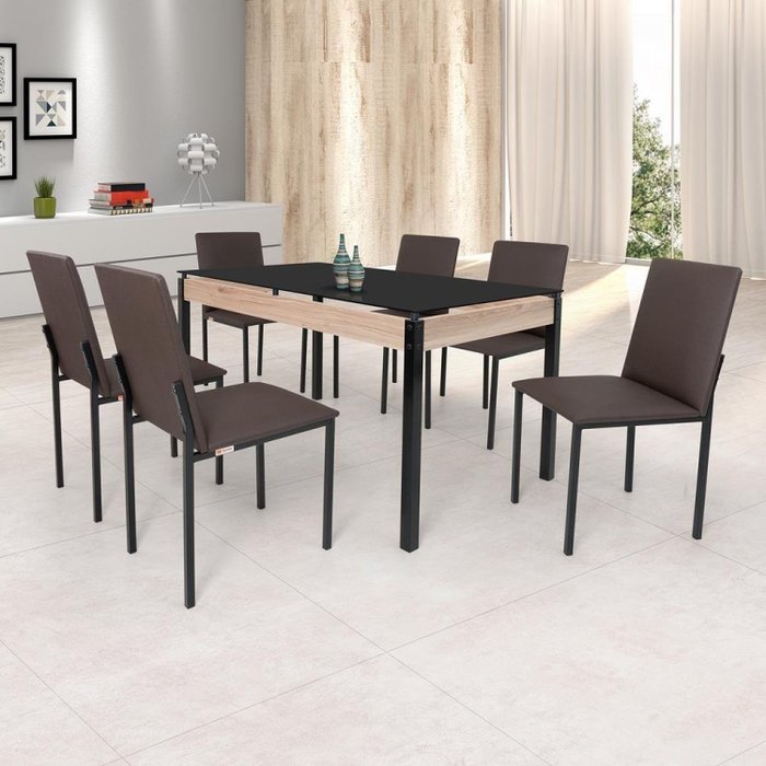 Conjunto Sala de Jantar Mesa 140x80cm Tampo Vidro com 6 Cadeiras Dubai Preto Fosco/Linho Marrom