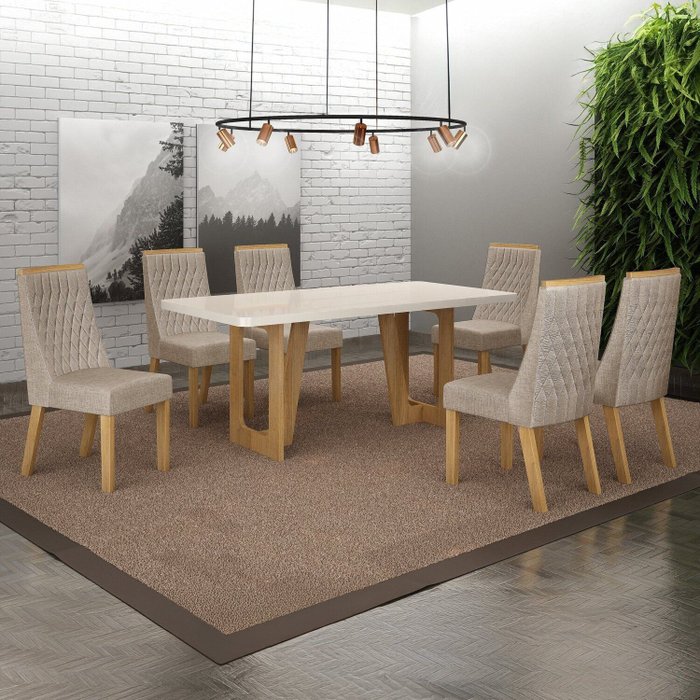 Conjunto Sala de Jantar Mesa 160cm Tampo de 4,0cm com 6 Cadeiras Luna Cinamomo/Off White/Bege Linho