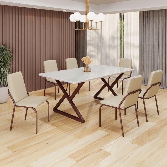 Este conjunto de mesa retangular e 6 cadeiras oferece estilo e praticidade. Com estrutura tubular em aço para estabilidade, o tampo em MDF Laca off white com vidro adiciona sofisticação e resistência a riscos e manchas. As cadeiras combinam harmoniosamente com a mesa, garantindo conforto com estofamento. Ideal para diversos espaços, é perfeito para receber convidados ou desfrutar de refeições em família, criando um ambiente acolhedor e elegante.