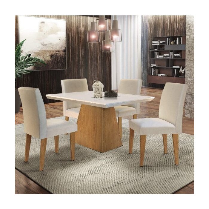 A sua casa não será mais a mesma depois do Conjunto de Mesa de Jantar Carolina com 4 Cadeiras. Sua estrutura em MDF promove qualidade e segurança para toda a sua família desfrutar deste móvel. Já a combinação de cores e as cadeiras com revestimento estofado deixam o visual da sua sala de jantar mais moderno. O tampo tem pintura resistente que não risca e de fácil limpeza.