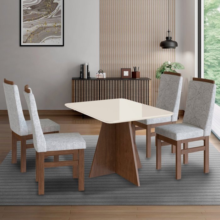Conjunto Sala de Jantar Mesa 90x120cm T Vidro com 4 Cadeiras Madeira Maciça Tabaco/Off White/cinza
