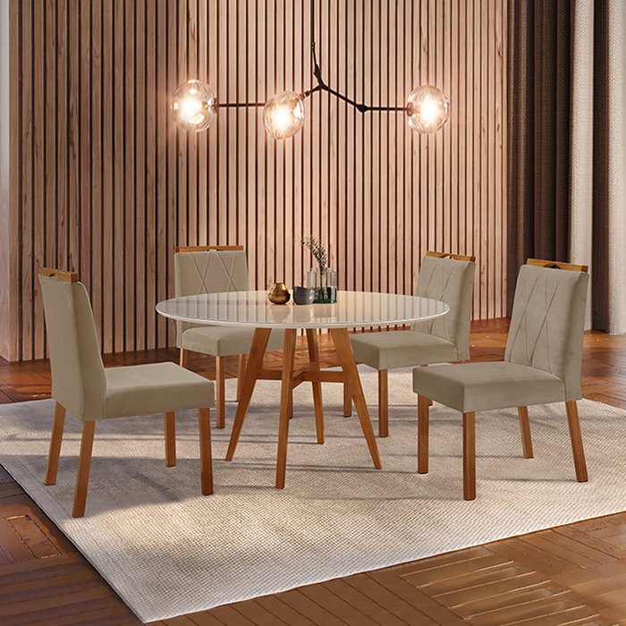 Conjunto Sala de Jantar Mesa Atenas Madeira Maciça 110cm Tampo Redondo Vidro Off White com 4 Cadeira Veludo Bege