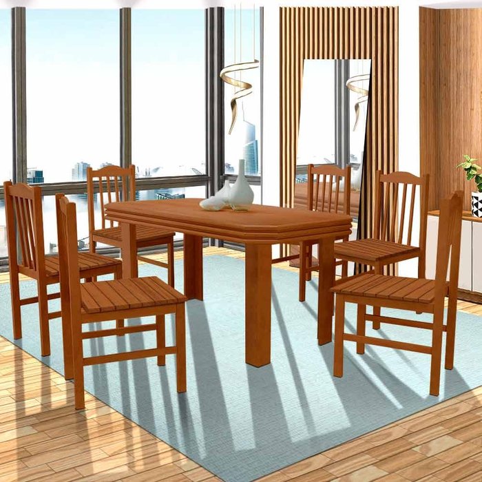 Dimensões da mesa: Altura 78 cm; Largura 85 cm; Profundidade 155 cm.Dimensões das cadeiras: Altura 95 cm; Largura 40 cm; Profundidade 42 cm.Distância do assento até o chão: 47 cm- Kit inclui 1 mesa e 6 cadeiras- 100% madeira maciça de eucalipto- Acabamento com cantos arredondados- Pés da mesa com design moderno em L- Encosto inclinado nas cadeiras- Confortáveis e resistentes- Peso suportado por cadeira: 90 kg* Cadeiras são entregues montadasItens Inclusos: 1 mesa e 6 cadeirasComplexidade da montagem: Média, pode ser montado por apenas uma pessoa e/ou necessite de maior conhecimento para montagem.Recomendações de uso, manutenção e limpeza: Limpar com flanela ou pano macio seco, não utilizar produtos abrasivos, desengordurantes, álcool ou solvente. Não expor o produto diretamente à luz solar e à umidadeGarantia: 3 mesesOBS: Foto meramente ilustrativa, objetos, utensílios e decoração não fazem parte do produto.