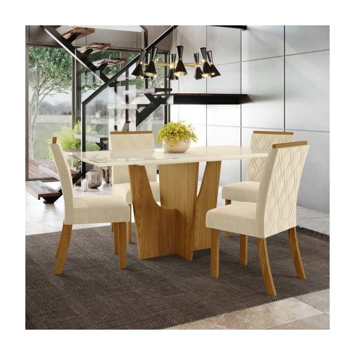 Este Conjunto de Sala de Jantar possui um design clean, com tons mais neutros e suaves, a mesa possui tampo de 25 mm que recebe uma sobreposição de vidro incolor de 4mm que garante maior qualidade e durabilidade ao produto. Sua medida é de 800mm de Altura, 1.600mm de Largura e 800mm de profundidade. As cadeiras que compõem o Conjunto possuem medidas de 950 mm de altura, 440 mm de largura e profundidade de 575 mm. Seus detalhes únicos proporcionam ao Conjunto um ar sofisticado e ao mesmo tempo transparece sua modernidade. Sua estrutura em MDF de 25 mm garante maior resistência e durabilidade ao móvel, tudo isso para lhe proporcionar excelentes momentos em família.