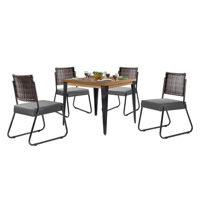 Conjunto Sala de Jantar Mesa Espanha 90cm com 4 Cadeiras em Aço e Junco Madri Mais Decor Linho Cinza