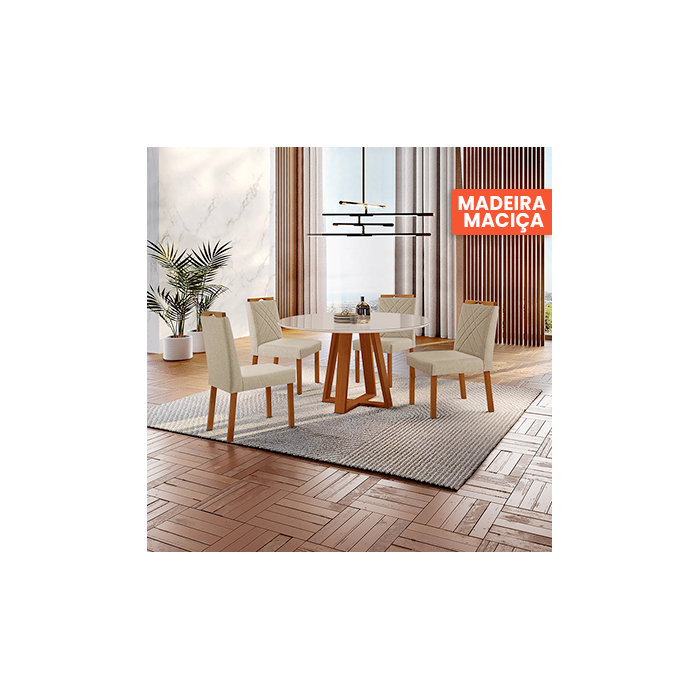 Conjunto Sala de Jantar Mesa Floripa 110cm Tampo Redondo Vidro/mdf Off White com 4 Cadeiras Dallas C Veludo Bege