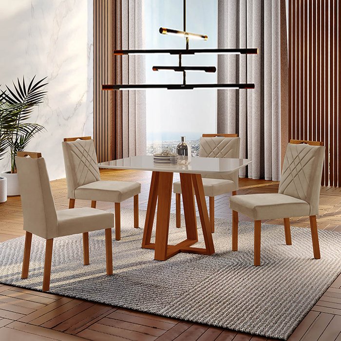 Conjunto Sala de Jantar Mesa Floripa Madeira Maciça 90x90cm Tampo Quadrado Vidro Off White com 4 Cad Veludo Bege