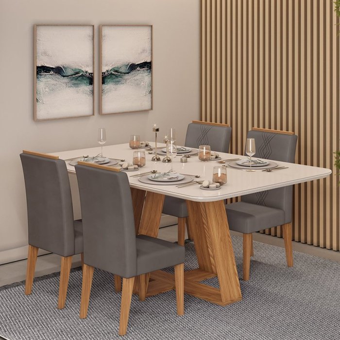 Conjunto Sala de Jantar Mesa Kiara 160x90cm Tampo Vidro/MDF com 4 Cadeiras Yasmin DJ Móveis