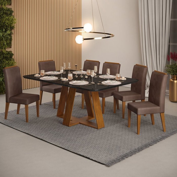 Conjunto Sala de Jantar Mesa Kiara 160x90cm Tampo Vidro/MDF com 6 Cadeiras Yasmin DJ Móveis Freijó/Preto/Veludo Moca