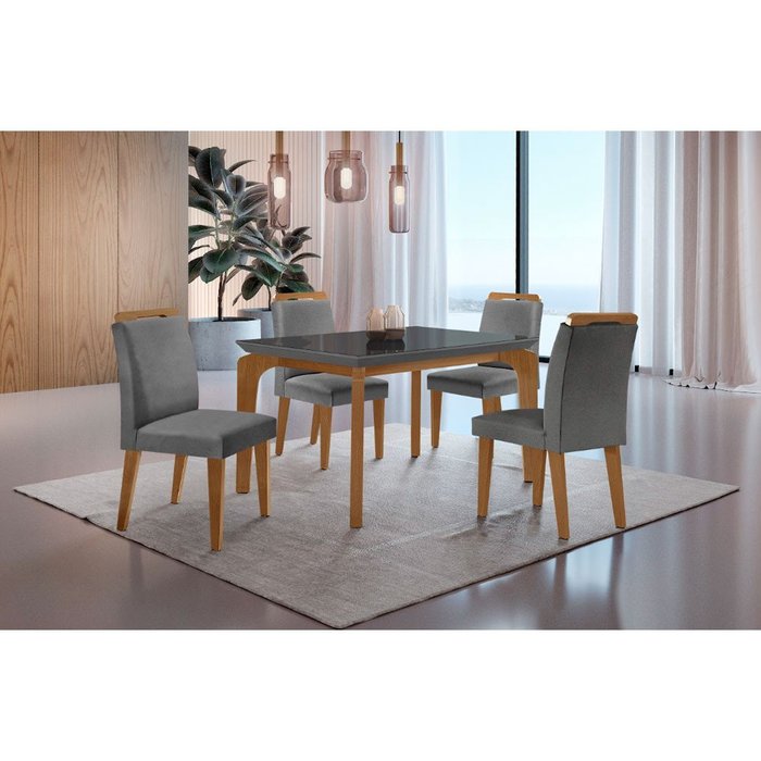 Conjunto Sala de Jantar Mesa Liz 120cm com Vidro Canto Reto e 4 Cadeiras Athenas Moderna Grafite/Imbuia