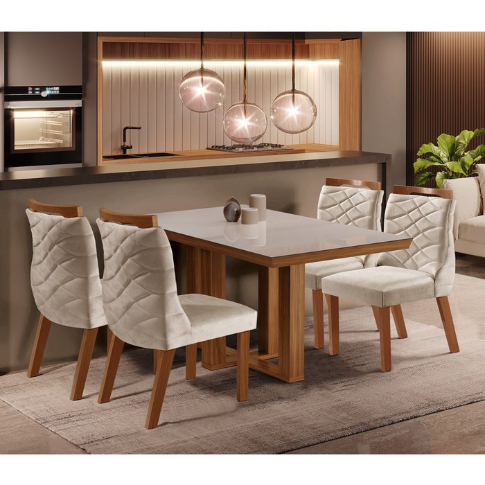 Conjunto Sala de Jantar Mesa Lottus Tampo MDF e Vidro e 4 Cadeiras Porto Prêmio/Creme/Off White