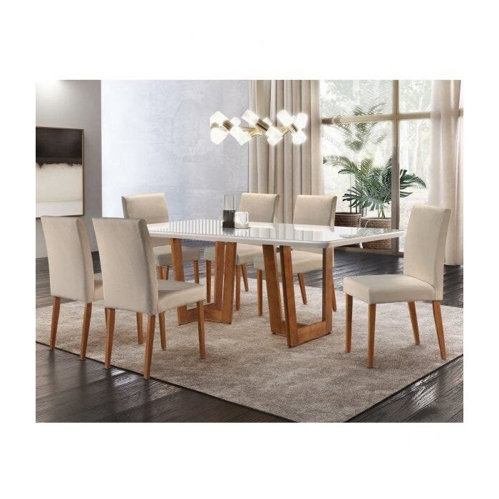Mesa produzida em madeira maciça tauari, tampo de madeira maciça com vidro de 4 mm por cima, e cadeiras estofadas com espuma de assento D26 e encosto, D18, e pés de madeira maciça. Sala de Jantar muito bem trabalhada, fazendo com que possamos atender nossos clientes com maior satisfação