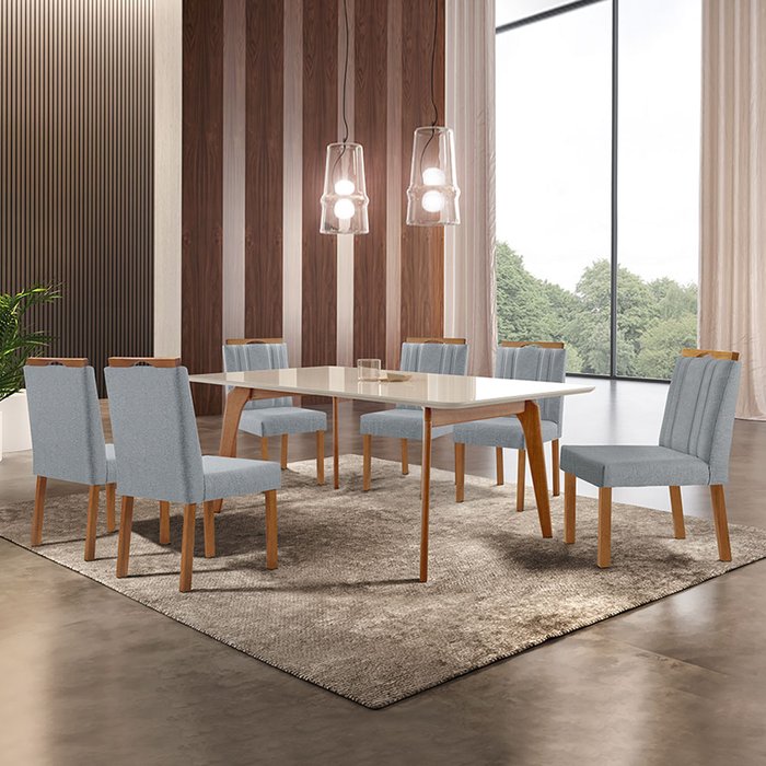 Conjunto Sala de Jantar Mesa Paris Madeira Maciça 180x90cm Tampo Retângular Vidro Off White com 6 Ca Linho Cinza