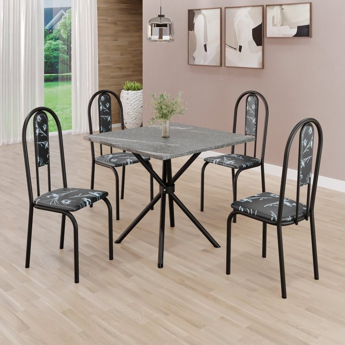 Este conjunto de mesa quadrada e 4 cadeiras oferece estilo e praticidade. Com estrutura tubular em aço para estabilidade, o tampo em pedra granito adiciona sofisticação e resistência a riscos e manchas. As cadeiras combinam harmoniosamente com a mesa, garantindo conforto com estofamento. Ideal para diversos espaços, é perfeito para receber convidados ou desfrutar de refeições em família, criando um ambiente acolhedor e elegante.